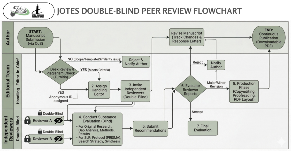 The Journal of Teaching and Education for Scholars (JOTES) strictly employs a Double-Blind Peer Review system. Every manuscript submitted to JOTES is subject to a rigorous, transparent, and objective evaluation by independent experts in the field of education. This process ensures the academic suitability, validity, novelty, and contribution of the published papers.